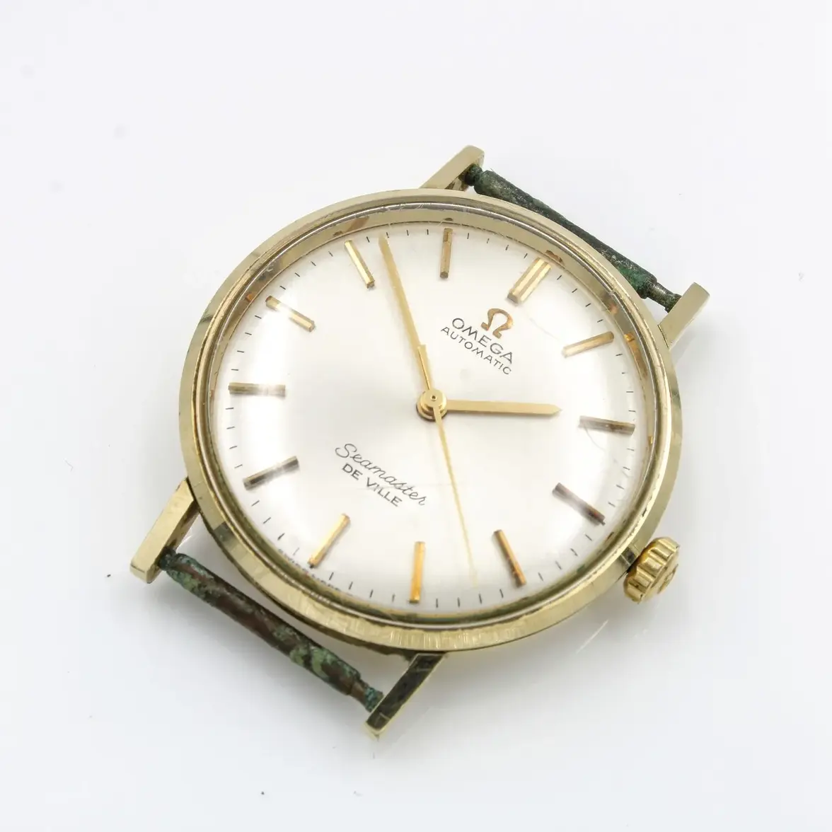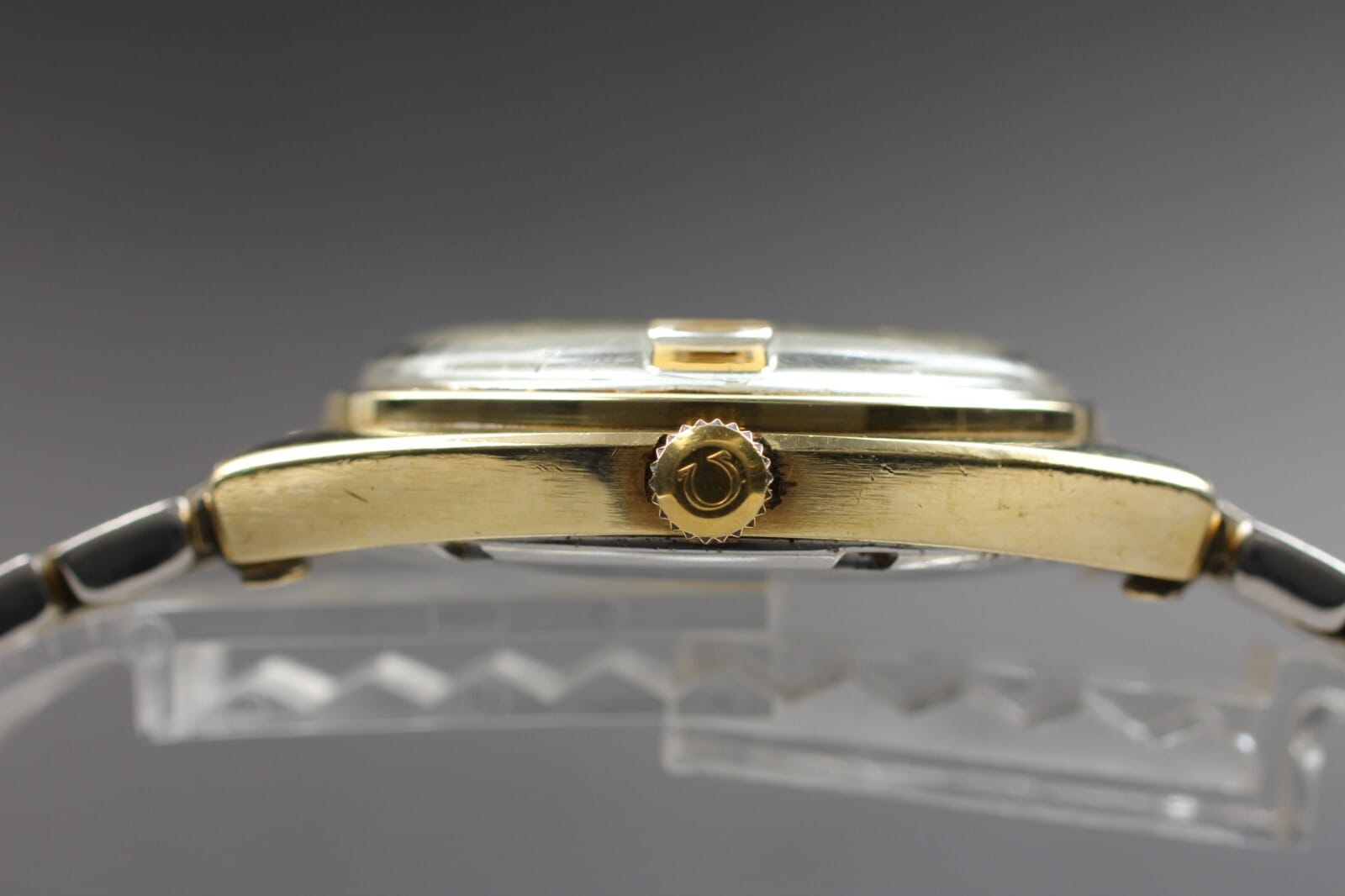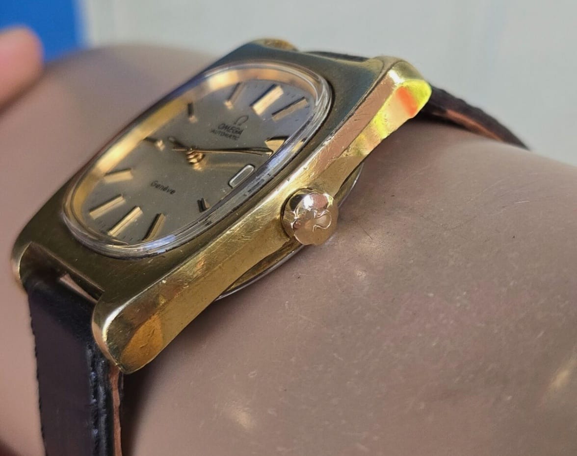 Gold-plated cases are highly prone to wear-through and this is exacerbated by the often basic shapes and sharp edges of Omega case designs in that era. Wear-through is most often seen on case edges, tips of lugs, and around the lugs where straps and bracelets are changed.