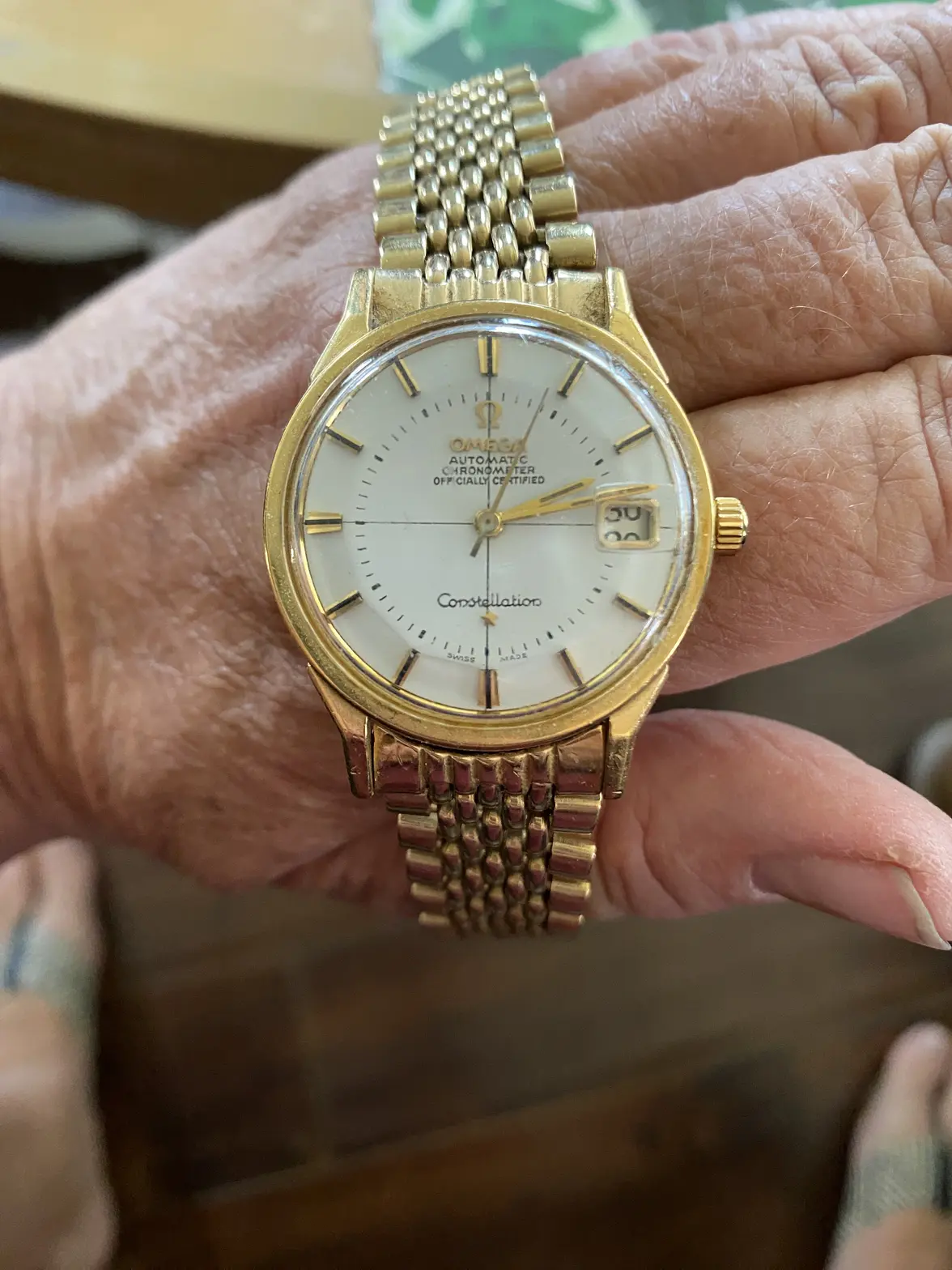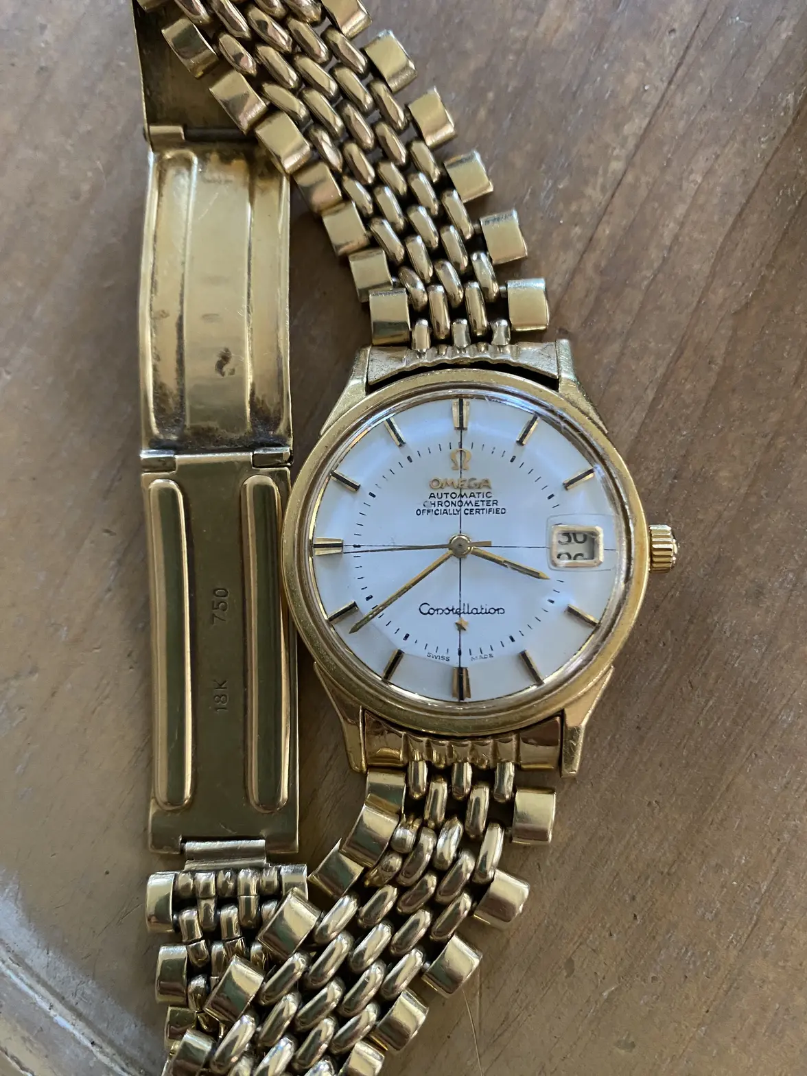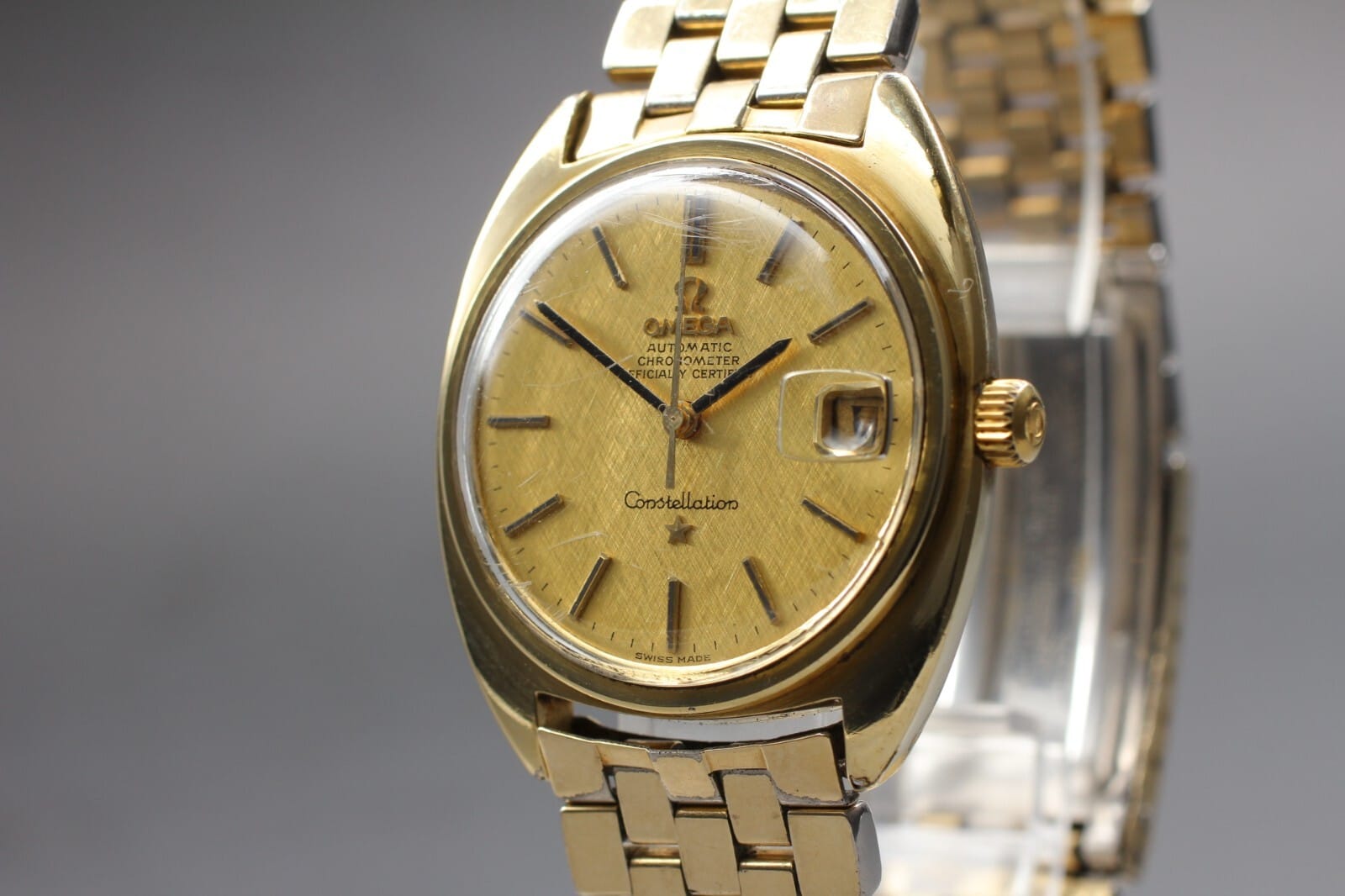 A very severely polished gold-capped C-Case Constellation with visible wear-through and significant loss of shape around the case edges