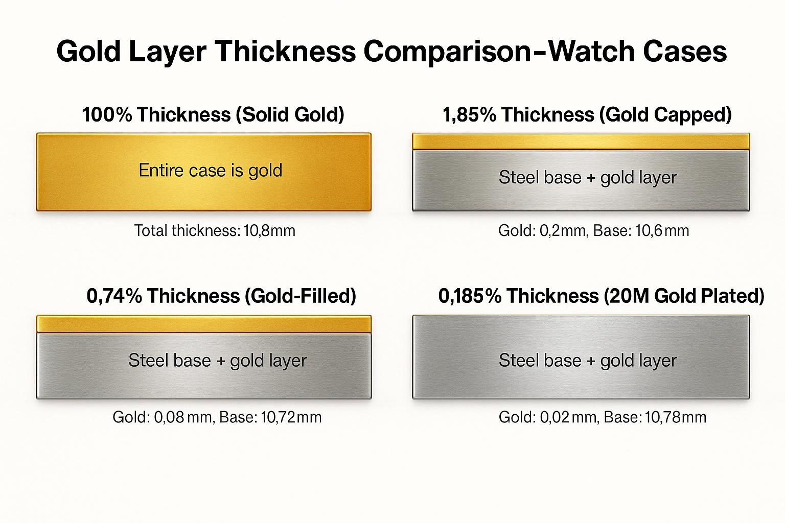 The thickness of the different metal types varies significantly. The average vintage Omega watch case of the 1960's, is around 10.8mm from front to back, the diagram below shows the relative thicknesses magnified 50X: